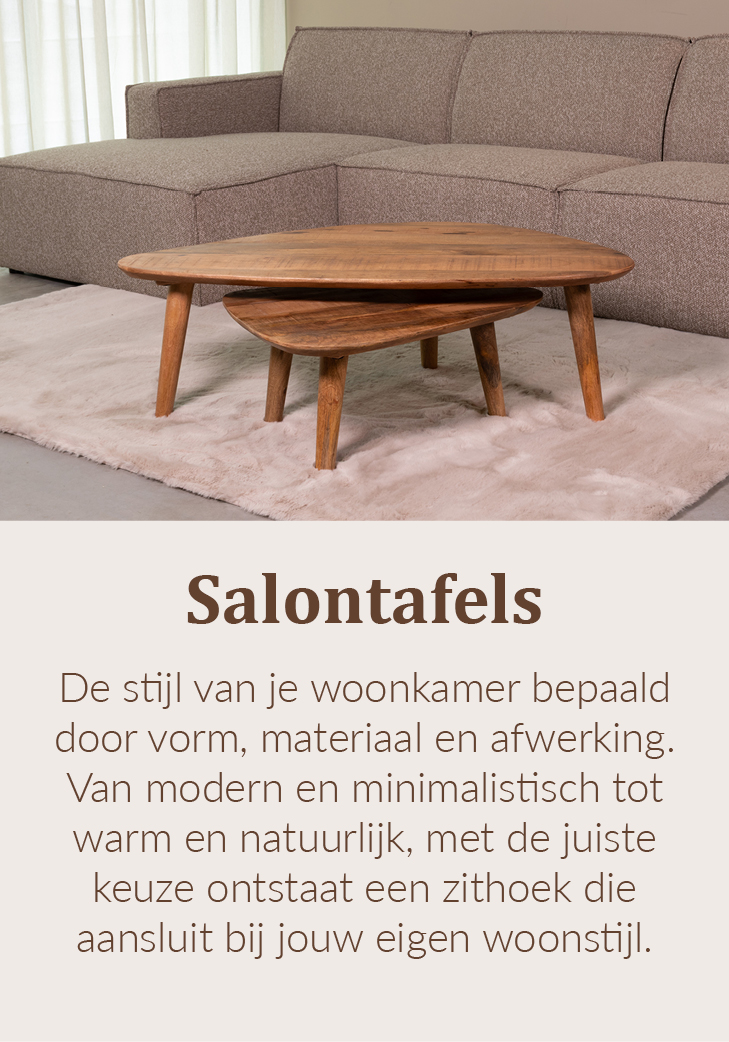 De stijl van je woonkamer bepaald door vorm, materiaal en afwerking. Van modern en minimalistisch tot warm en natuurlijk, met de juiste keuze ontstaat een zithoek die aansluit bij jouw eigen woonstijl. Salontafels brengen balans en samenhang in de ruimte en vormen een praktisch én sfeervol middelpunt van jouw woonkamer.
